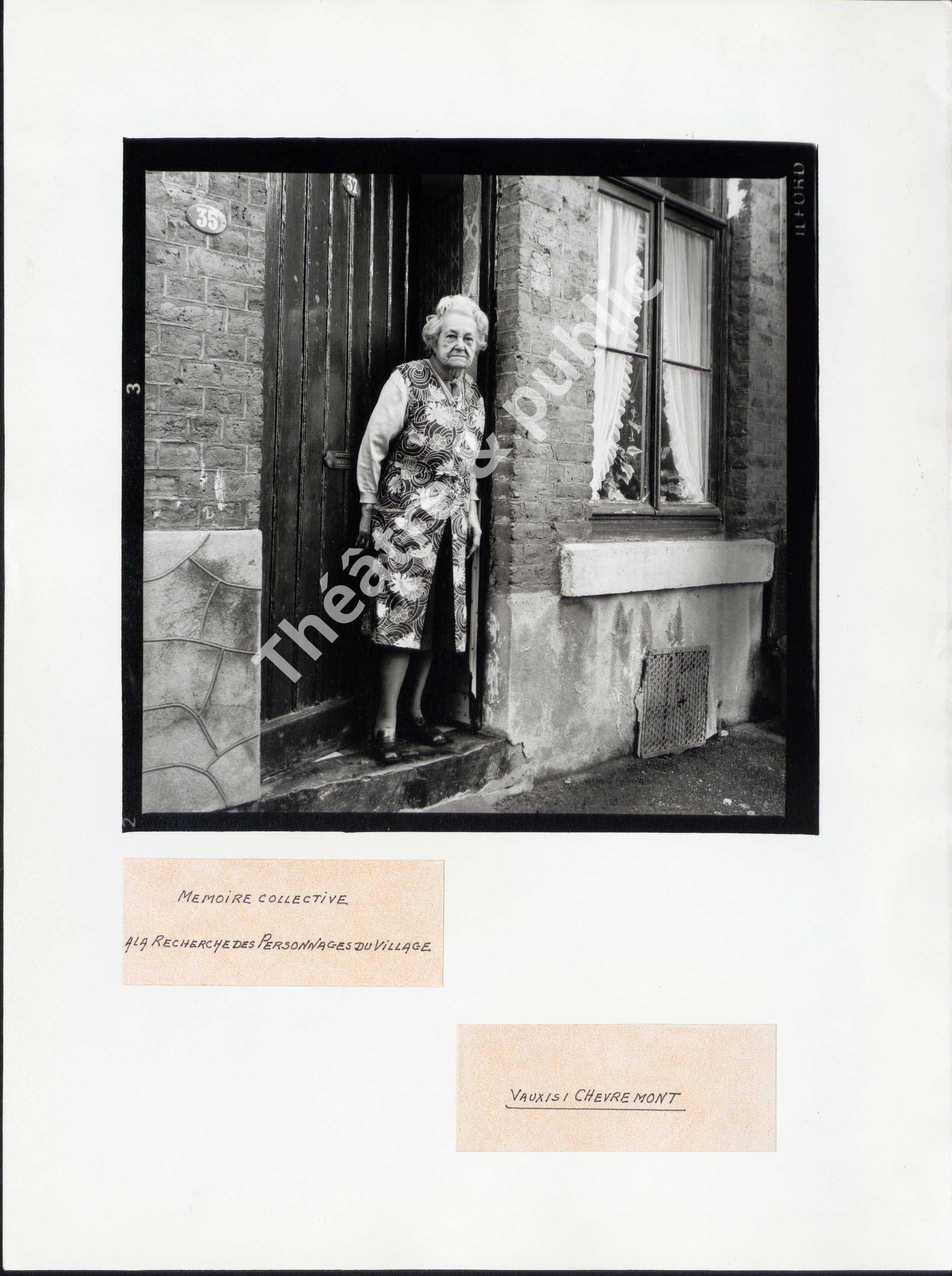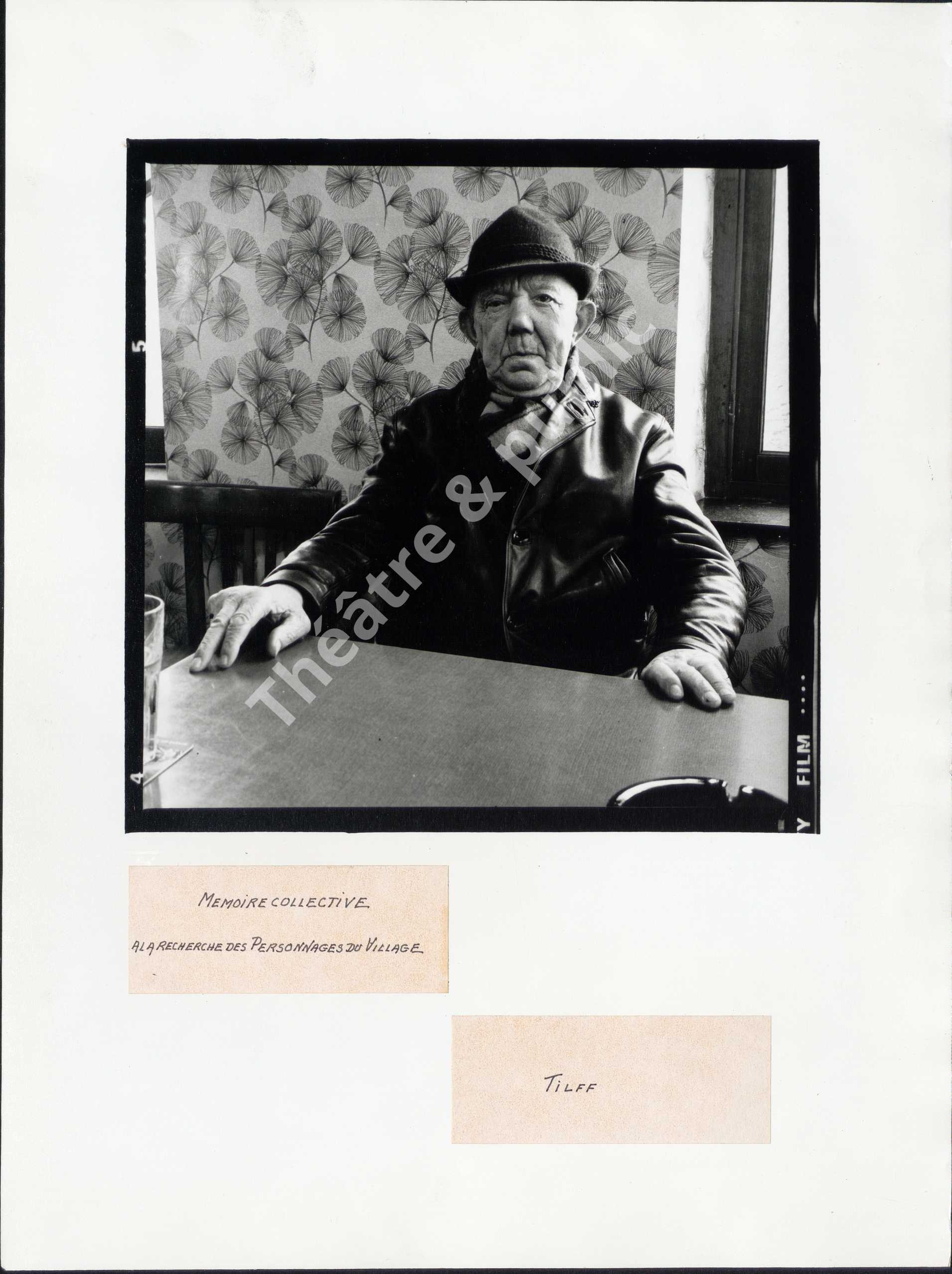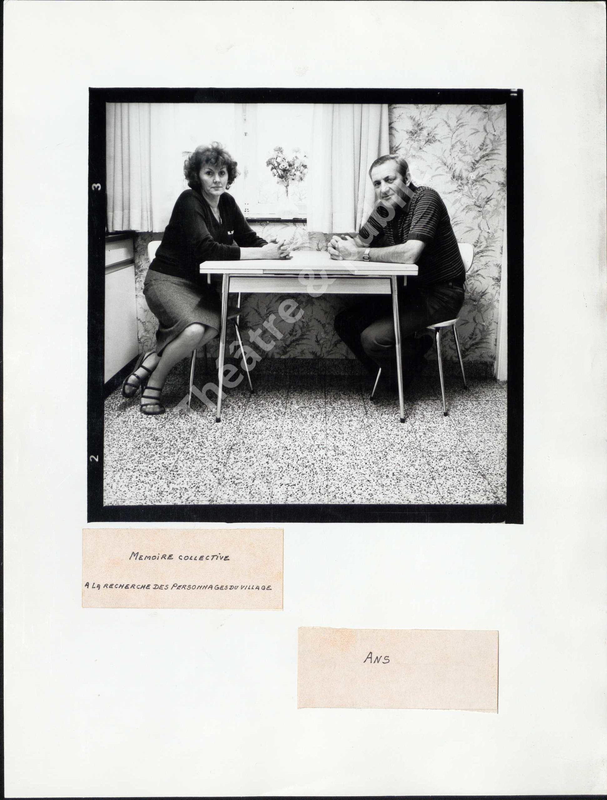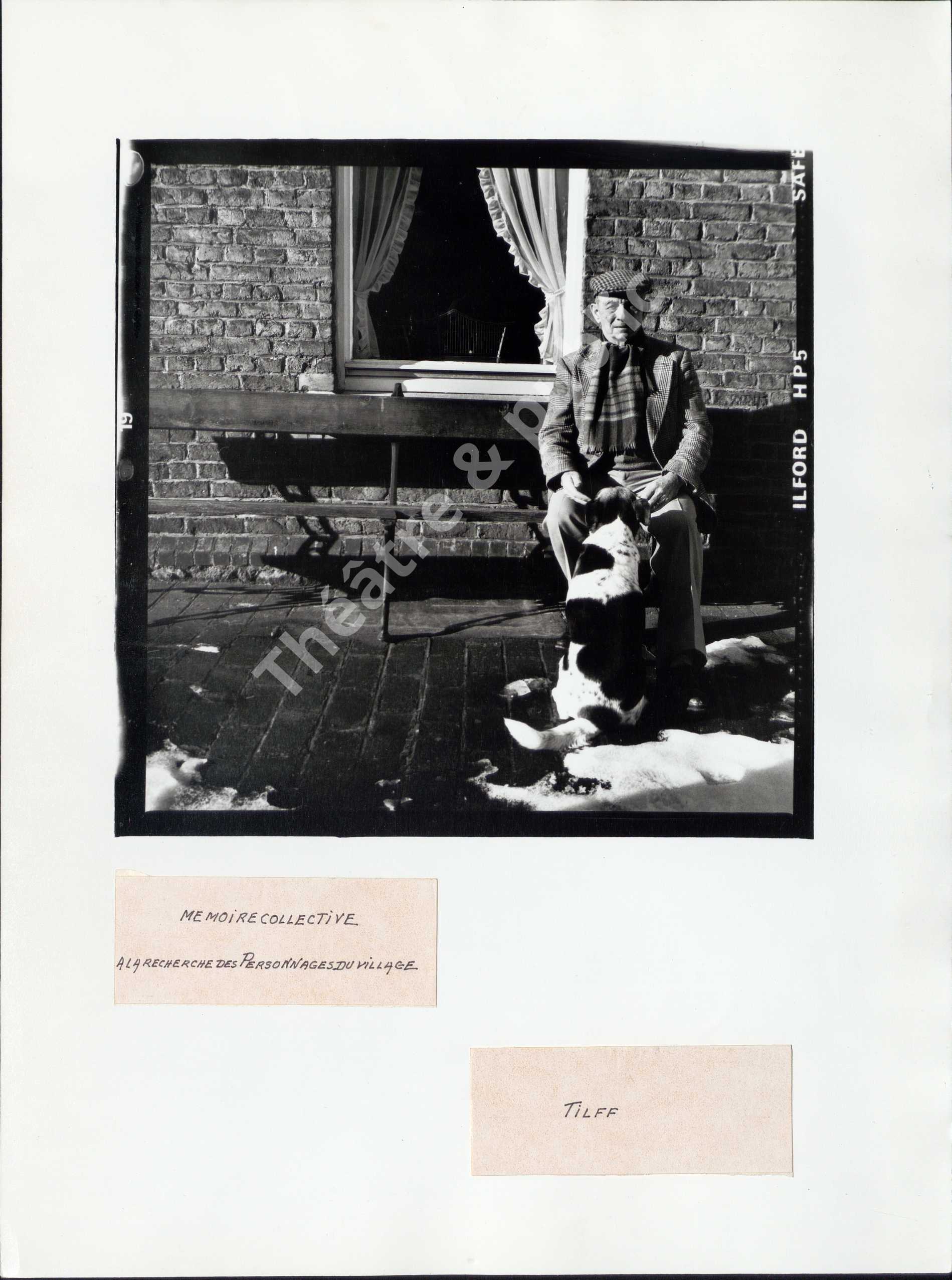 En préparant une numérisation, l’équipe tombe sur une farde de grandes feuilles A3 retraçant une expérience pédagogique menée en 1982 dans un village de la région liégeoise. À l’intérieur : des portraits noirs et blancs, tirages originaux en 6×6, représentant les habitant·es du village. Ces images avaient servi de matériau aux comédiens pour approcher le réel des publics devant lesquels ils allaient jouer. Lors des représentations, elles étaient exposées aux côtés de photographies personnelles prêtées par les habitants, capturant un moment charnière dans la transformation de la campagne liégeoise.