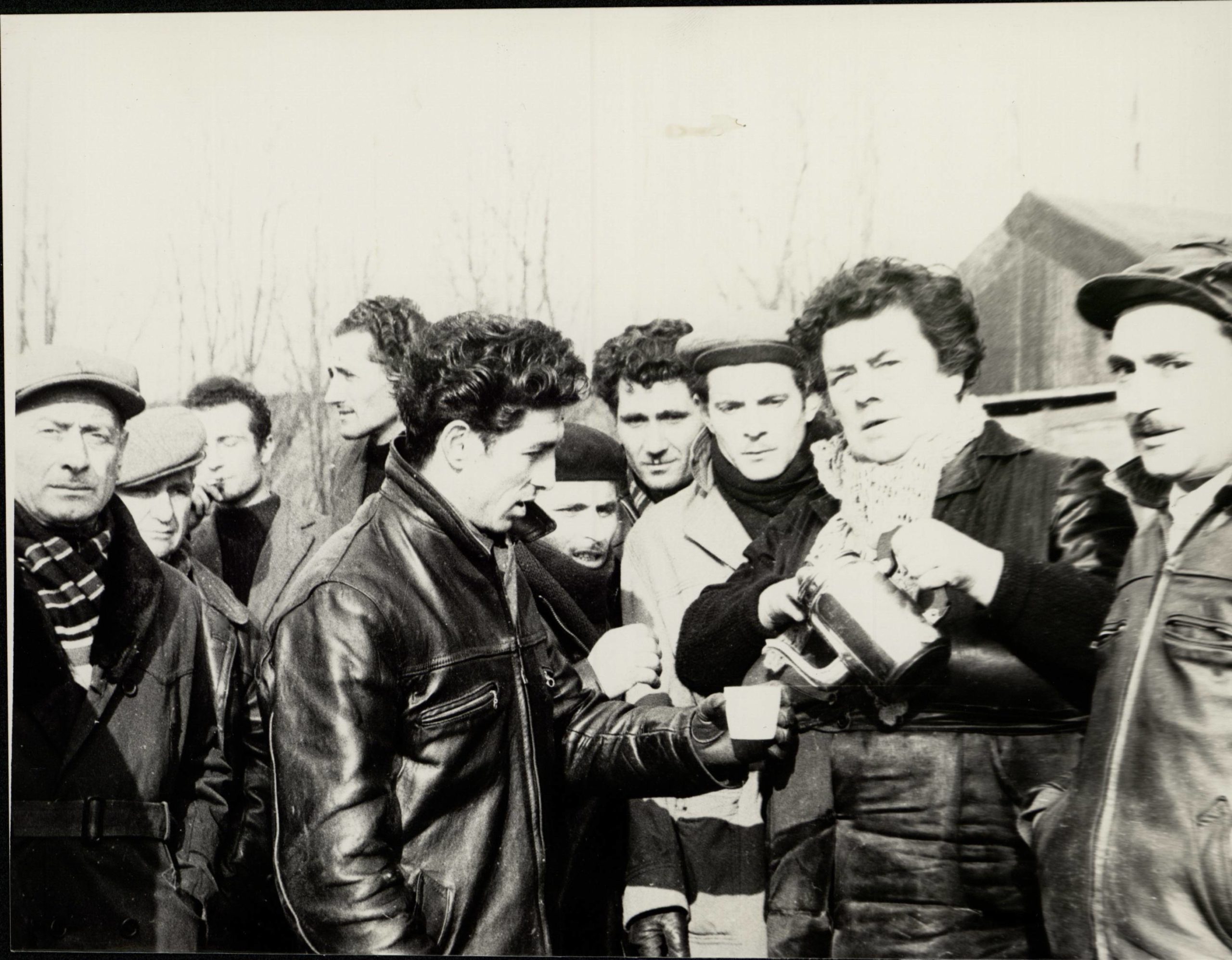 Grève des mineurs. Morlanwelz, Puits Saint-Arthur. Au Puits Saint-Arthur, à Morlanwelz, une femme sert du café au piquet de grève, photographie par Le Drapeau Rouge, 21/02/1959, Collections photographiques du CArCoB, cote PHO 0704