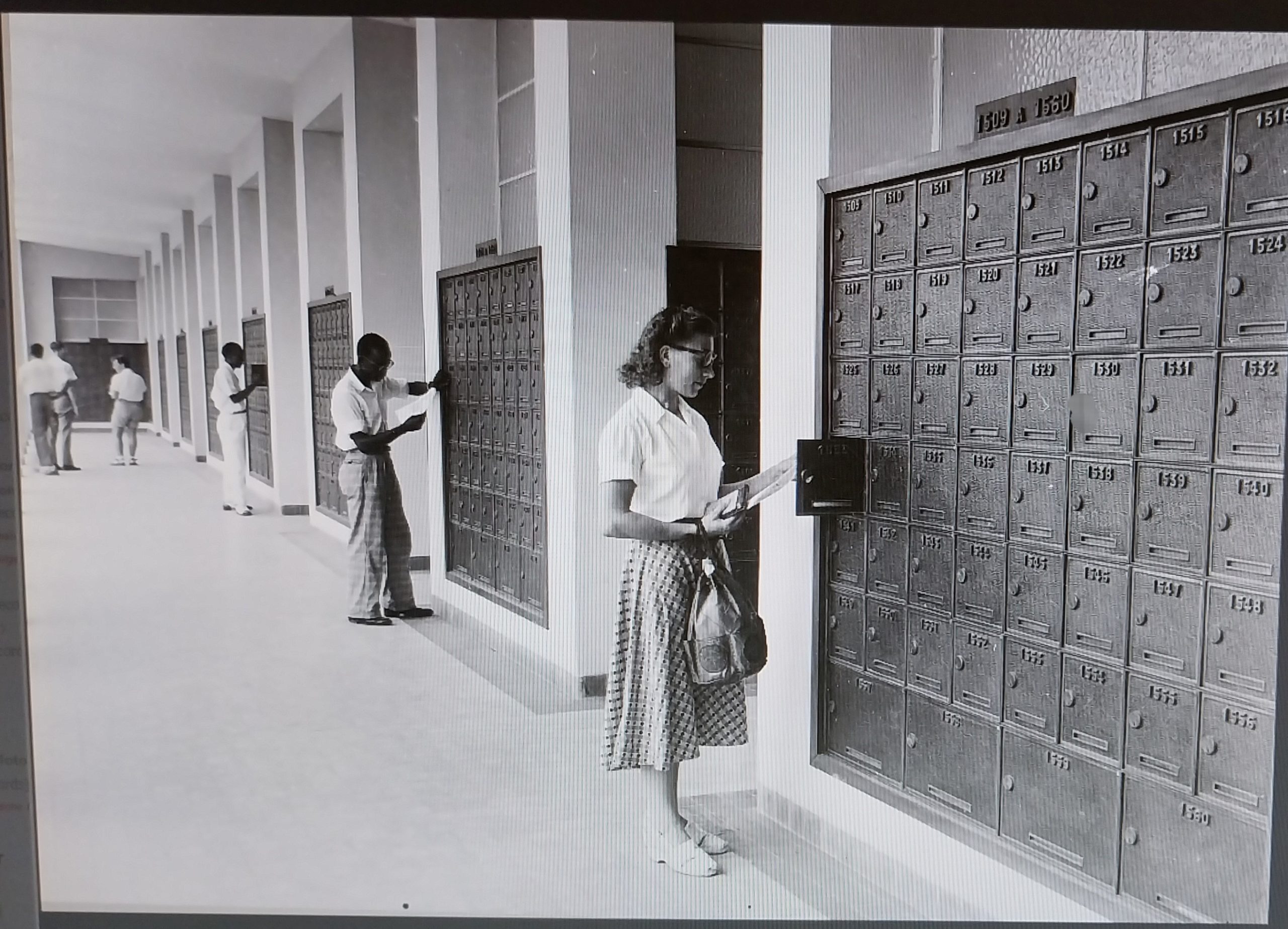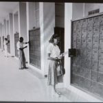 La première : une photographie de la galerie de boîtes postales de Léopoldville (1955) conservée dans la photothèque du Musée de l’Afrique. Elle témoigne de la continuité d’un système mis en place par Léopold II dès la fin du XIXᵉ siècle et devenu moteur économique. En 1955, les locations de boîtes postales rapportaient à elles seules quatre millions de francs par an à la colonie.