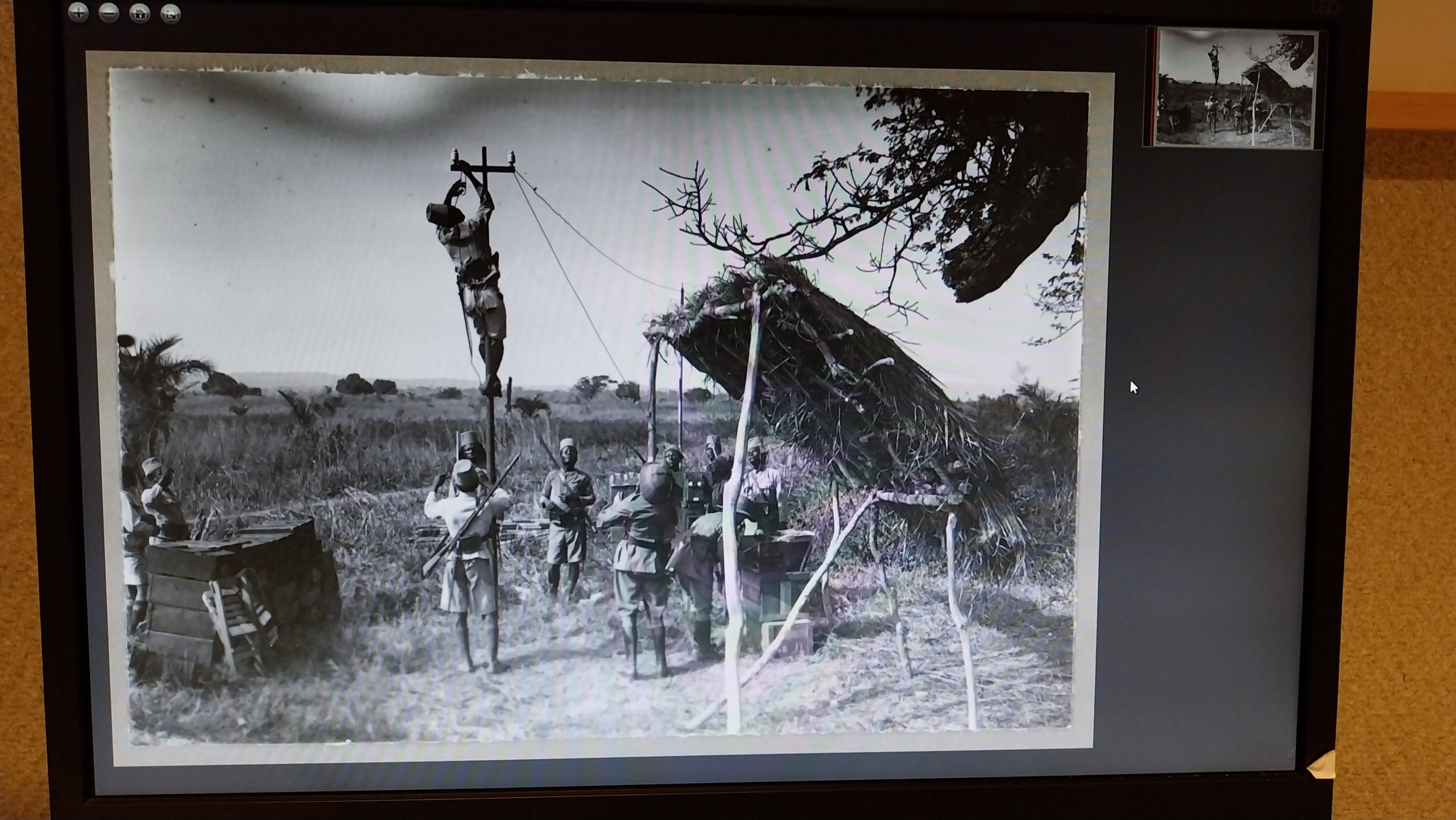 La seconde : un cliché daté de 1914 montrant des troupes de la Force publique installant une ligne télégraphique aérienne à Kigoma.